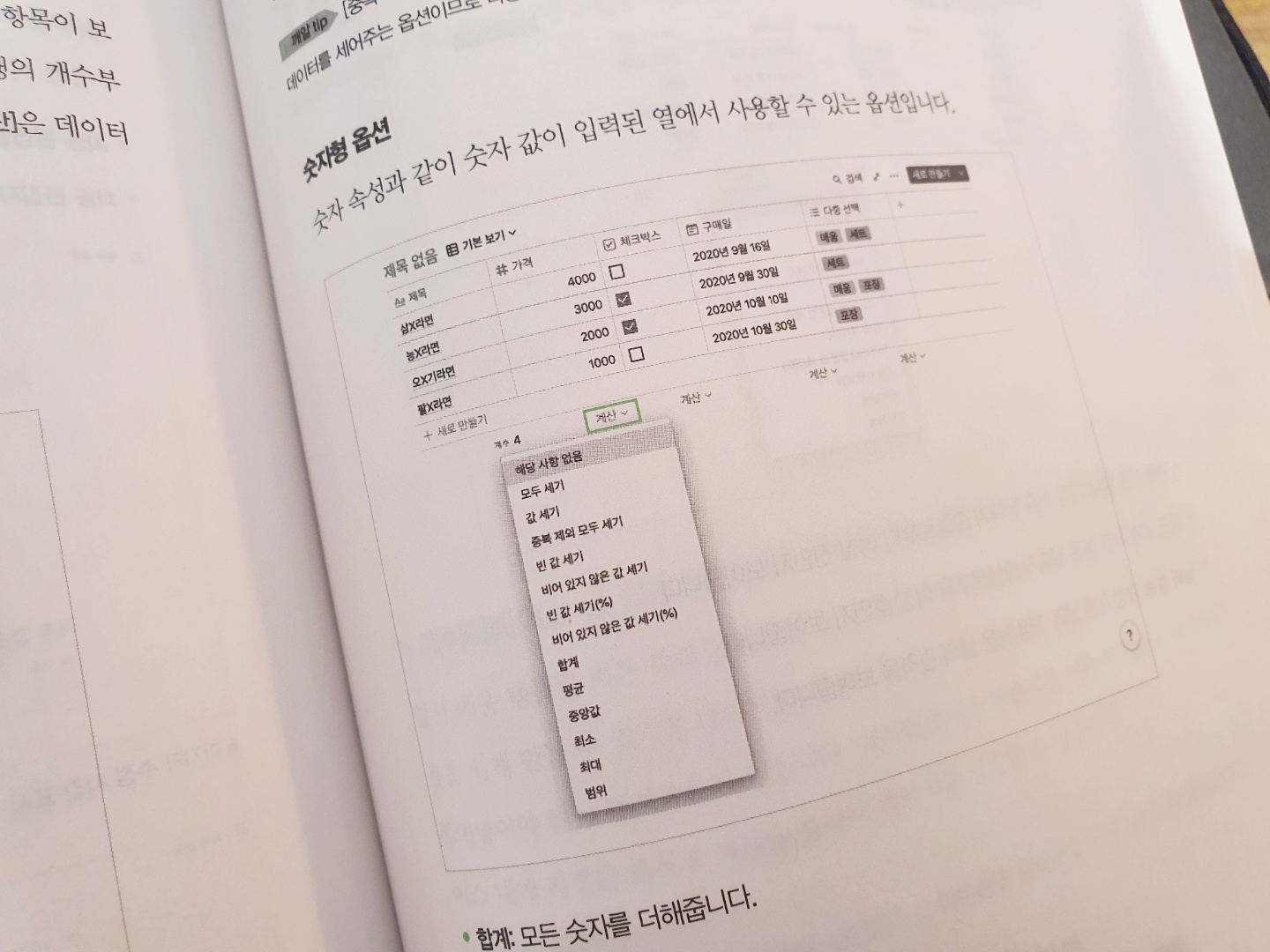 노션은 마이크로 소프트의 엑셀과 같이 데이터 시트를 작성할 수 있도록 데이터베이스를 지원한다. 위 운동 기록 역시 데이터베이스를 사용했다. 각각의 Column 의 속성 (글자, 숫자, 날짜, 선택형 등) 에 대해서도 지정할 수 있다. 아래 그림과 같이 숫자 타입일 경우에는 합계, 평균 등 그 Column 에서 만들어낼 수 있는 간단한 계산 값들을 생성해낼 수 있다. 책을 참고해보면 알겠지만 엑셀과 같이 셀 내부에서 특정 수식을 이용해서 사용자가 직접 숫자를 계산하는 방법을 사용할 수도 있다. 나는 이 기능을 이용해서 가계부를 작성하는데 사용하고 있다.