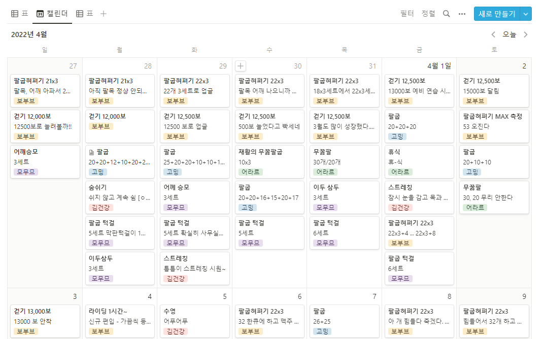나는 이 기능을 친구들과 운동을 기록하는데도 사용하고 있는데, 사용 예는 아래와 같다. 하나의 페이지 (표) 에 서로 각자 기록하고 캘린더로 변환해서 관리한다. 아래 이미지의 한칸 한칸은 노션에서 말하는 페이지라는 문서의 단위인데, 데이터 베이스 기능을 이용하면 아래와 같이 하나로 통합해서 볼 수도 있다. 글로 표현하니 어렵지만 책을 보면서 따라해보면 1분도 걸리지 않는다. 아니, 심지어 안보고 해도 대충은 할 수 있다. 그 정도로 사용법이 쉽다.