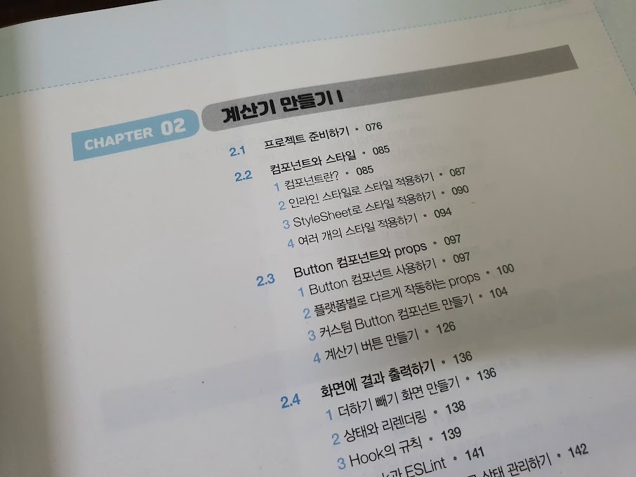 이 책은 시작하자마자 바로 작은 프로젝트를 시작합니다. 개념을 배운 다음 해보는 구조는 아니네요. 직접 만들어보면서 바로바로 새로운 내용들을 배우기 때문에 좀 더 성취감이 있는 공부를 할 수 있습니다. 3가지 프로젝트를 진행합니다. 계산기, TODO 리스트, 여행 사진 공유 앱입니다.