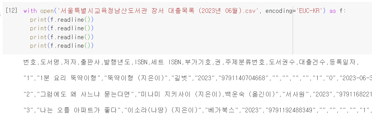 with open('서울특별시교육청남산도서관 장서 대출목록 (2023년 06월).csv', encoding='EUC-KR') as f: