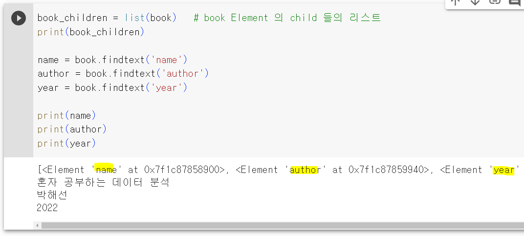 - Element.findtext('tag') 를 사용하면 객체 내부의 특정 tag 에 둘러 쌓인 문자열을 가져올 수 있음