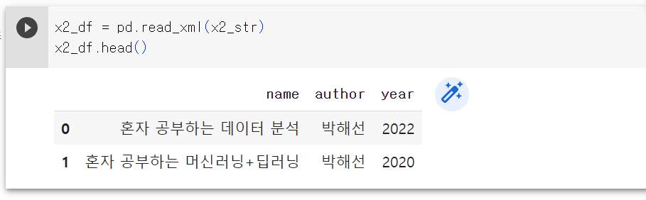- read_xml(str) 을 사용해서 XML 문자열을 판다스 데이터프레임으로 변환