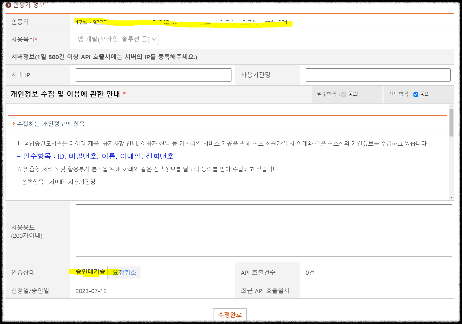 [마이페이지] 에서 인증키를 발급 받을 수 있습니다. 적당한 사용목적을 체크하고 개인정보 수집 관련 사항에 동의한 후 수정완료 버튼을 눌러줍니다.
