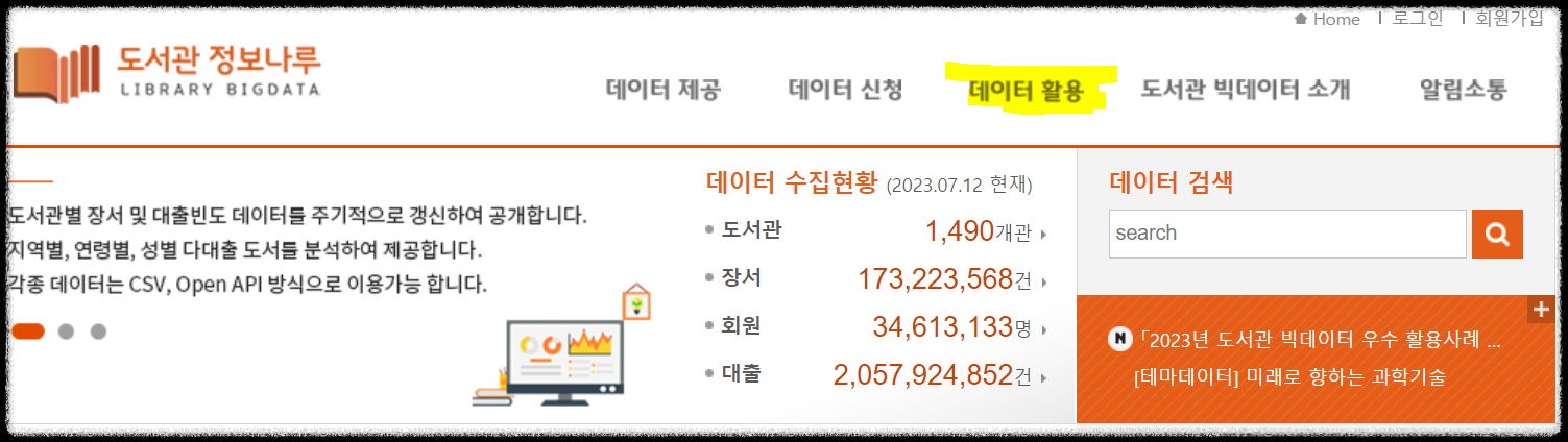 먼저 도서관 정보나루 홈페이지에 접속합니다.