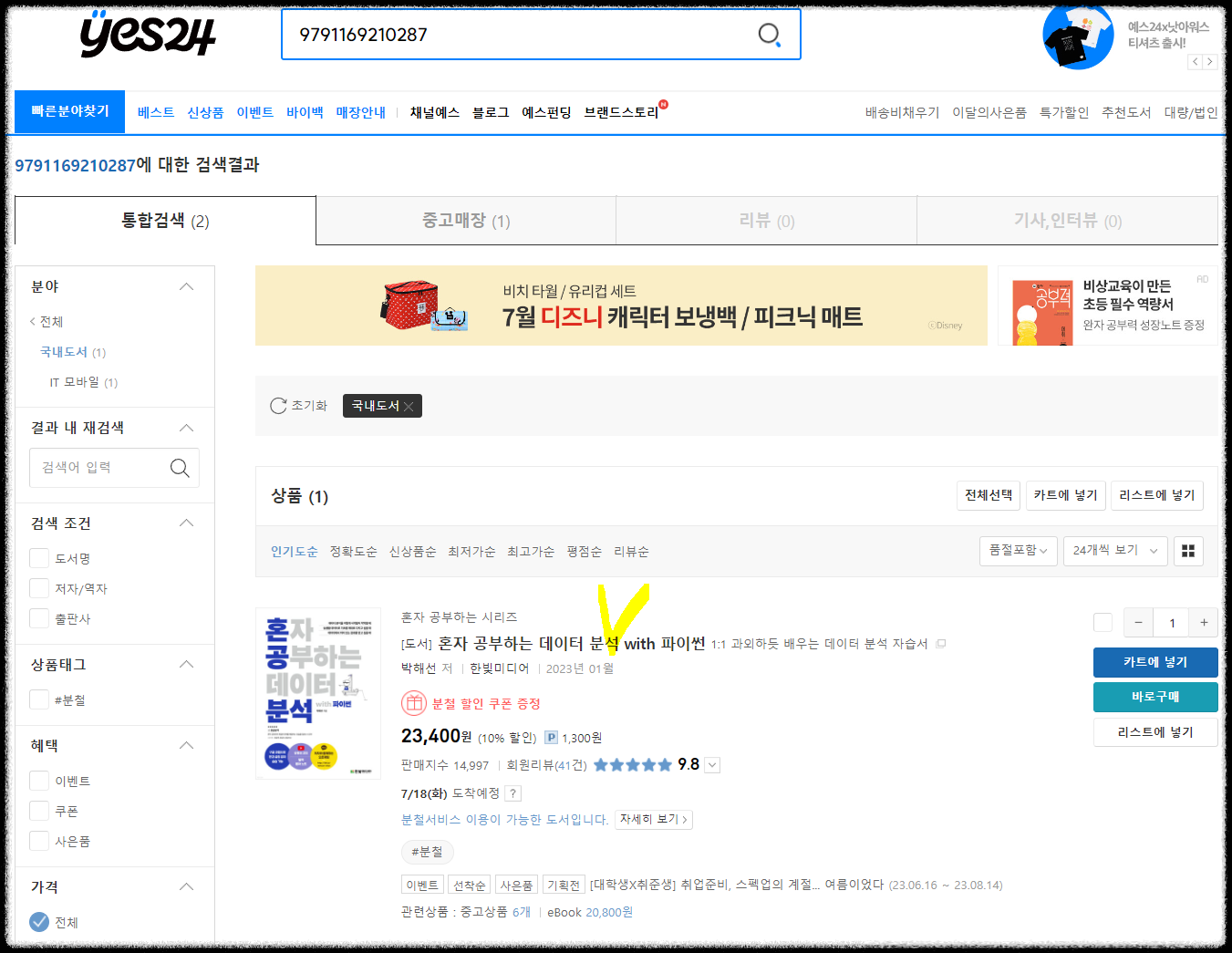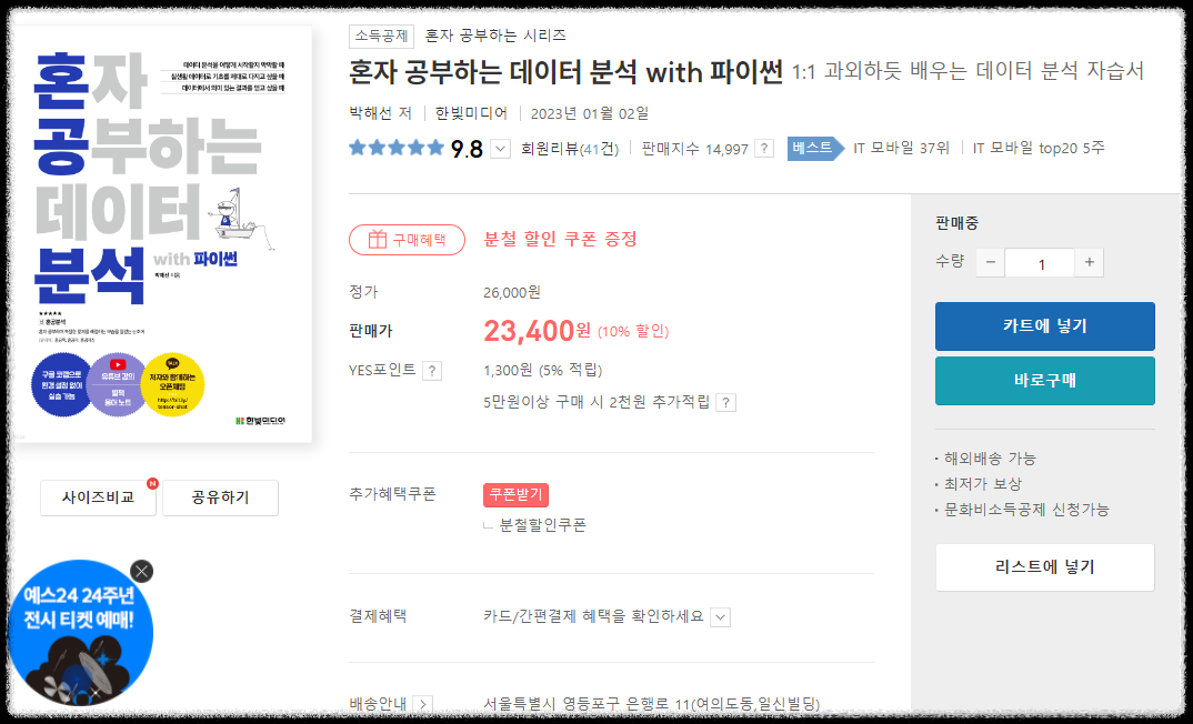 책 『혼자 공부하는 데이터 분석』 의 페이지 수를 Yes24 홈페이지에서 크롤링하기