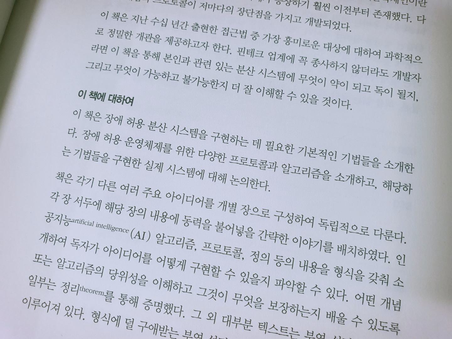 그렇다고 딱히 많이 어려운 내용이 포함되어 있지는 않다. 기본서로 보기는 무리가 많지만 학부 3학년 수준의 자료구조, 알고리즘 수업만 충실하게 들은 대학생정도면 충분히 이해할 수 있는 정도지 않나 싶다. 다만 앞에서 말했듯이 이런 책은 "분산원장" 이라는 하나의 목적을 두고 관련된 알고리즘을 소개하고 증명하고 있기 때문에 이 분야에 관심이 없으면 이해가 되고 말고를 떠나서 재미가 없어서 읽다 던지기 마련이다.
