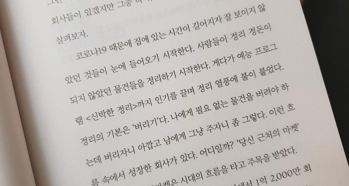 6장은 소비를 중심으로 우리의 삶에 대해 전반적으로 이야기한다. 아마존과 알리바바에 의한 온라인 쇼핑 시장의 세계화, 새로운 소비 기준이 된 "집" 으로 인해 <구해줘 홈즈>, <신박한 정리> 등의 예능이 흥하고 이와 함께 당근마켓과 같은 중고마켓 시장이 활성화된 점. 배달과 구독 서비스, OTT를 항상 달고 살아가게 되었고 시장을 이끄는 기업들 (네이버, 카카오, 쿠팡 등) 은 여전히 새로운 구독 서비스와 혜택을 제공하면서 마치 이를 사용하지 않으면 뒤쳐지고 손해인 것처럼 유혹하고 있는 부분 등을 설명한다.
